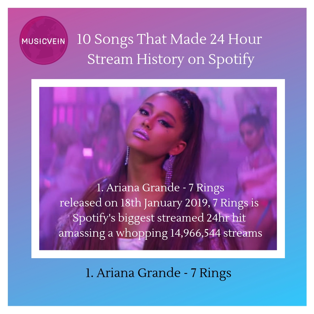 Ariana Grande broke the Spotify 24hr stream record with her latest release “7 Rings”.