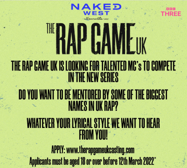 “The Rap Game UK” is coming back for a fourth series in 2022. We are searching for the UKs best unsigned MCs to take part. Competing artists in the Programme will be mentored and supported by some of the biggest names in the UK rap scene, and one artist will win the prize, which is currently to be confirmed.